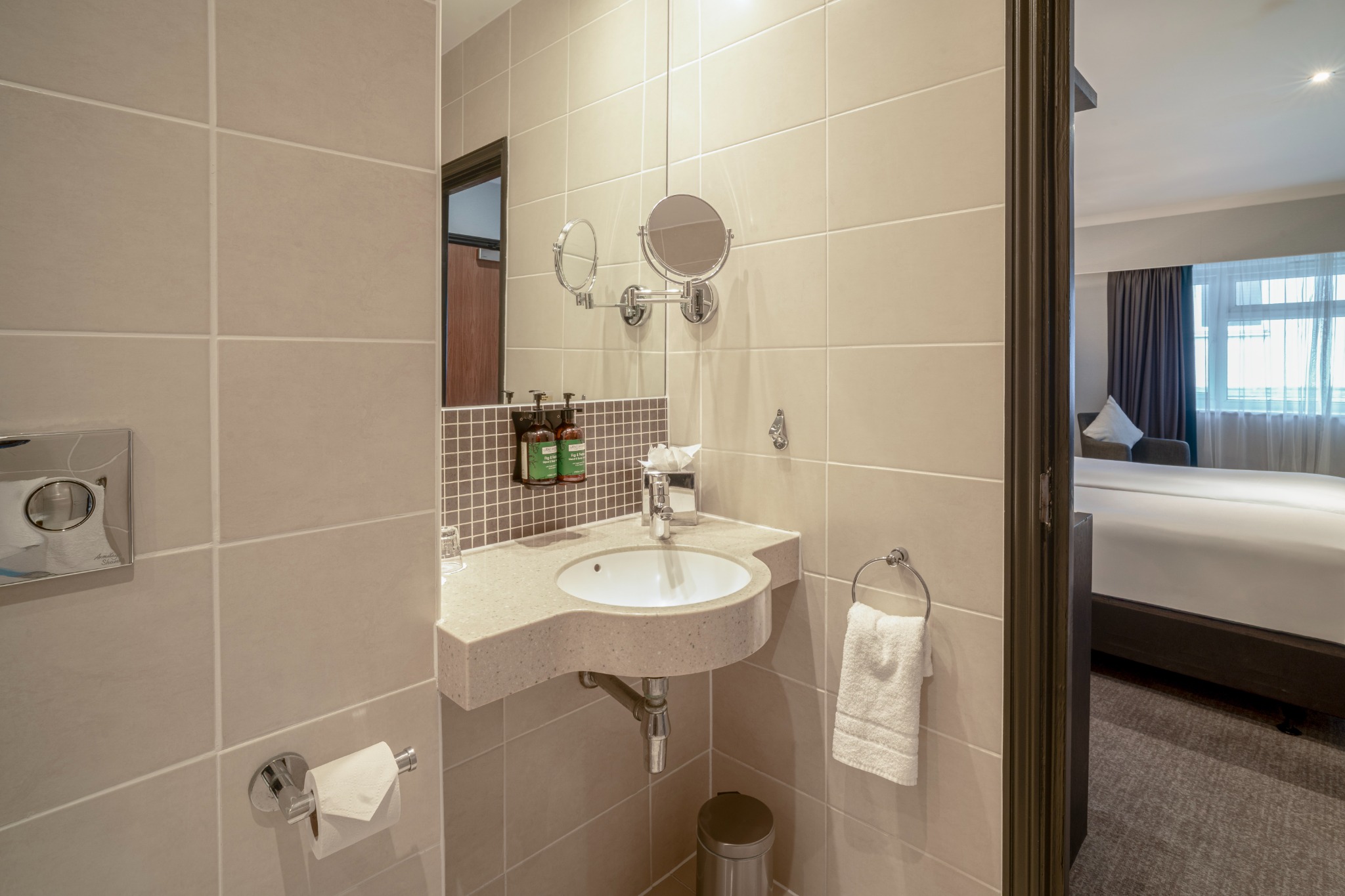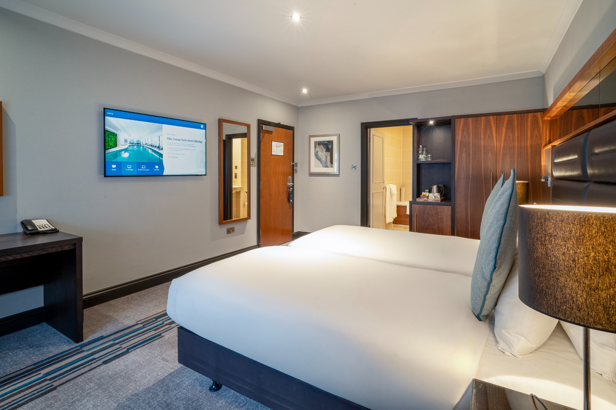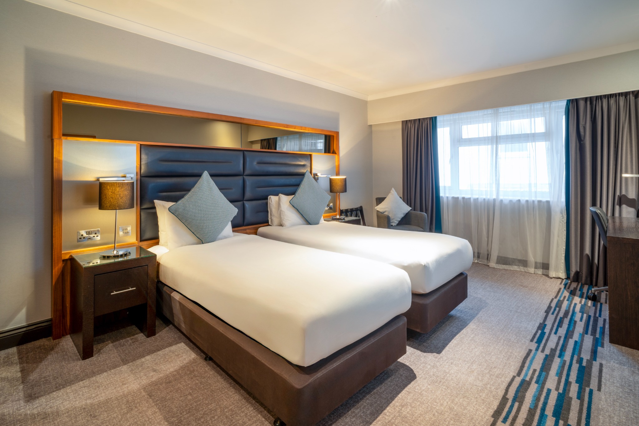 A stylish Twin Room offering everything you need for a comfortable and enjoyable stay. Filled with natural light and elegant décor, it provides the convenience of complimentary Wi-Fi, a private en-suite bathroom, and in-room essentials including a television and other modern features. The room also presents a cosy carpeted layout and thoughtful details designed to enhance your experience.