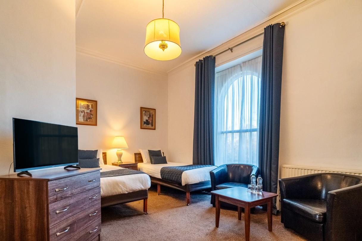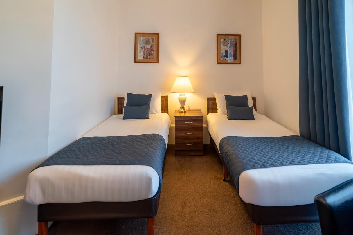 A comfortable Twin Room offering everything you need for a restful and enjoyable stay. Filled with natural light and stylish décor, it provides the convenience of complimentary Wi-Fi, a private en-suite bathroom, and in-room essentials including a television and other modern features. The room also presents a cosy carpeted layout and thoughtful details designed to make you feel at home.
