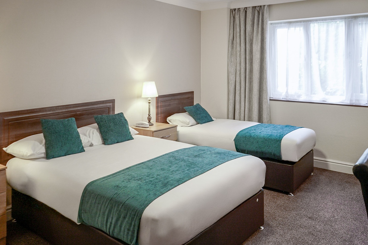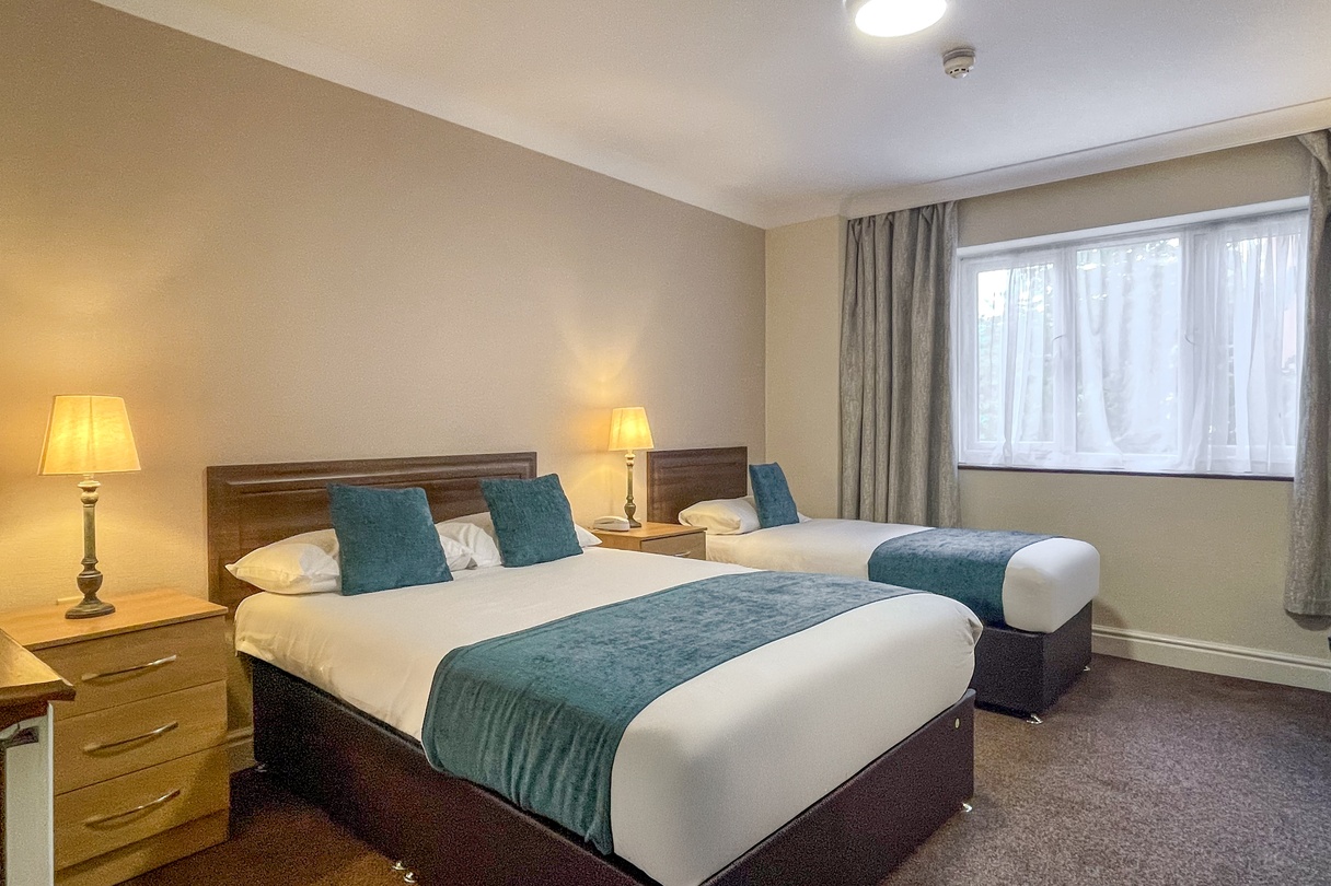 A spacious Family Room offering everything you need for a restful and enjoyable stay. Featuring one double bed and one single, it is filled with natural light and stylish décor, and provides the convenience of complimentary Wi-Fi, a private en-suite bathroom, and in-room essentials including a television and other modern features. The room also presents a cosy carpeted layout and thoughtful details designed to make you feel at home.